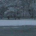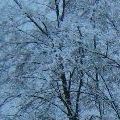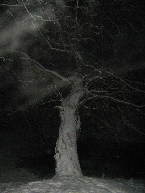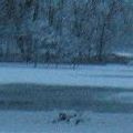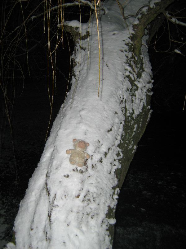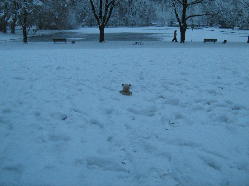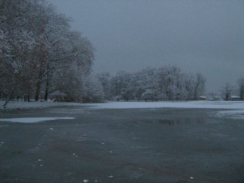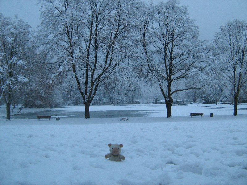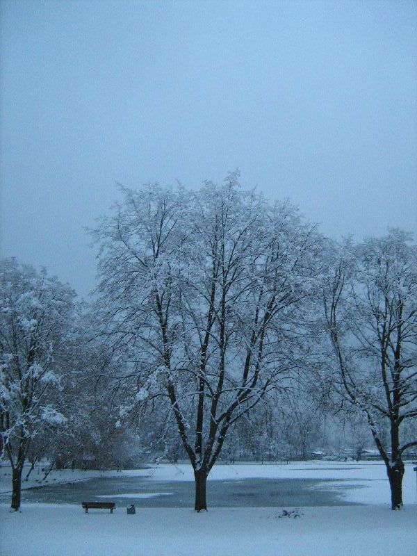 Die Bäume sind toll, was? Schneeweiß. Das im Hintergrund ist übrigens der Weiher. Meine arme,