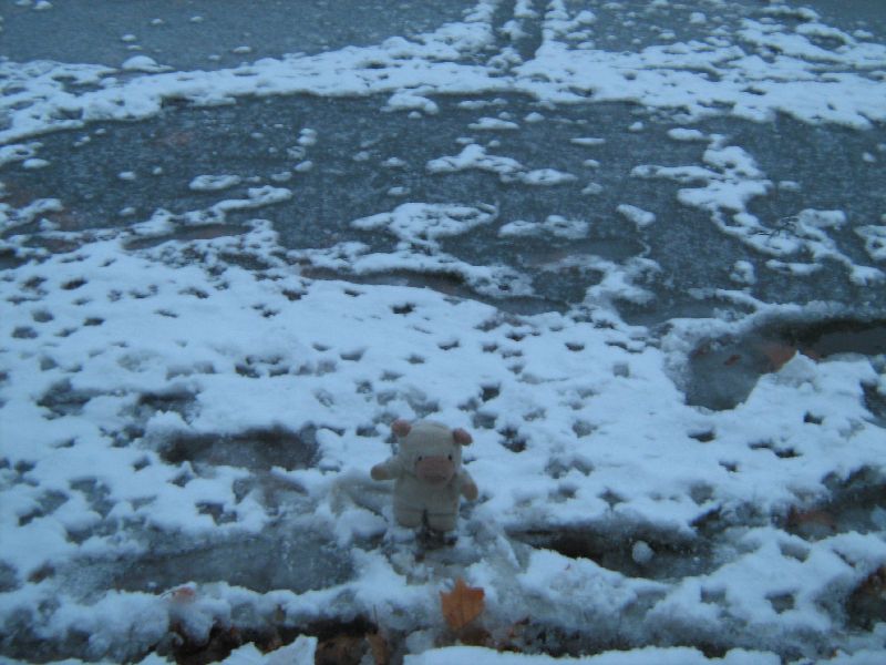 Da stehe ich auf dem Weiher, der größtenteils zugefroren war. Also fast überall. Meine beiden